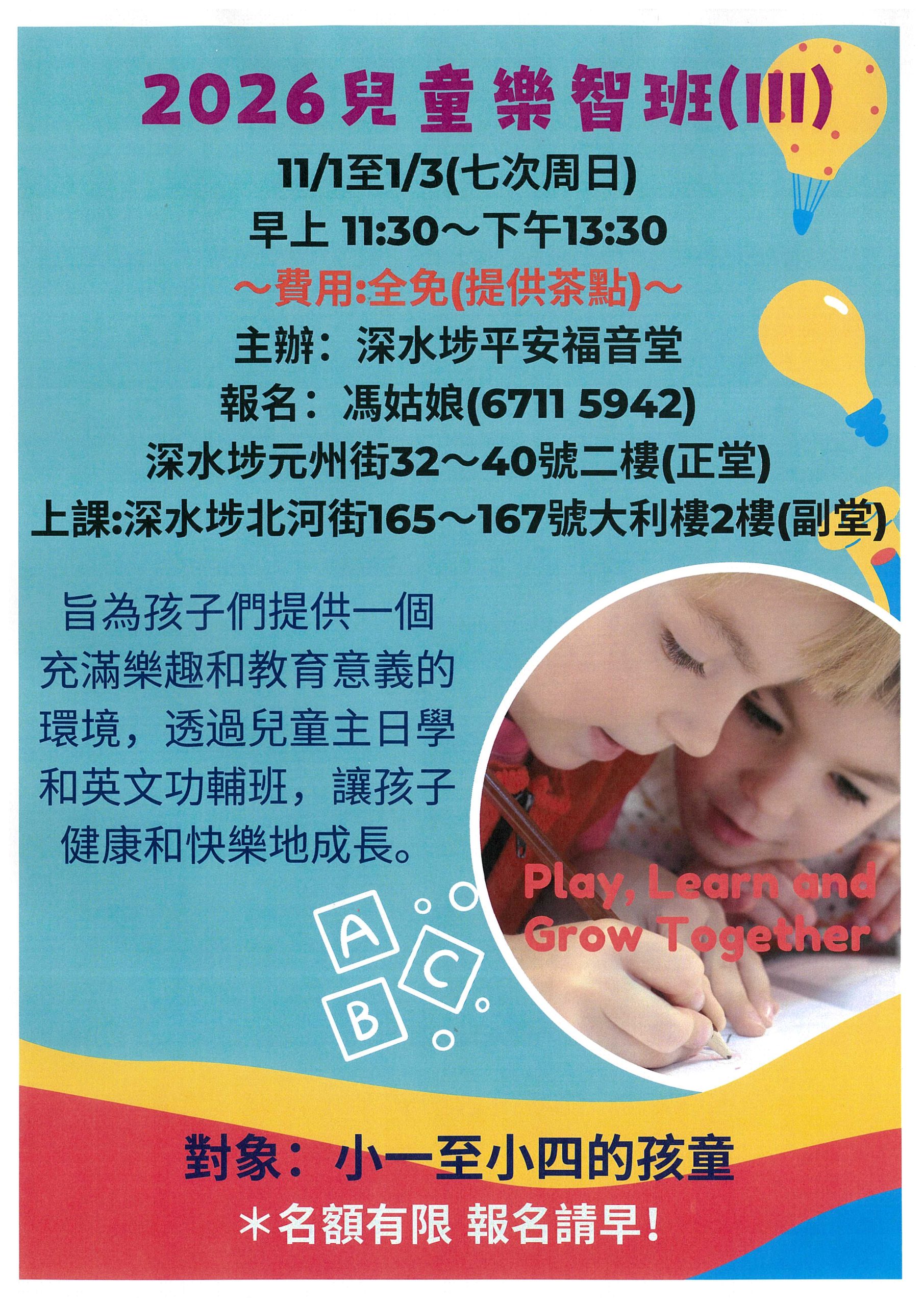 2024 banner Bcarnival-2025 這家就是永生神的教會,真理的柱石和根基。提摩太前書三章15下 深水埗現時天氣 多雲,現時氣溫為15°C現時氣溫為16°C,相對濕度為61%。 資料來至香港文天台 (更新時間:2025年12月14日06時02分) 深水埗平安福音堂 座落在深水埗元洲街四十多年,是一所純正基督信仰的教會。本教會高舉「聖經為最高權威」﹑重視「人人皆祭司」﹑恆常「擘餅記念主」等真理 … ( 更多詳情 ) 歡迎聯絡我們,了解更多基督的信仰。 主日崇拜時間 早上10:00至11:00講道會(正堂)任何人士 早上10:15至11:00少年崇拜(副堂3/F)中學生 早上11:30至12:30信仰分享小組(正堂)慕道或初信者 早上11:30至12:30兒童主日學(副堂2/F)K1-P6 兒童 更多詳情 教會最新活動 2026兒童樂智班(III)poster媽咪烘焙班(III)海報 福音主日 日期: 2025-12-21 (星期日) 10:15 網上直播 「平安在社區」嘉年華 每月金句 你們要互相款待,不發怨言。各人要照所得的恩賜彼此服事,作神百般恩賜的好管家。彼前四9-10 2025特別聚會 12月21日 福音主日12月28日 感恩主日及愛筵 兒童福音畫板 福音畫板是以珍貴的福音為藍本設計,加上更為生動的插圖,方便向小朋友分享福音的內容。 相交活動相片 2025-04-26 「平安在社區」嘉年華 友好連結 平安福音聯堂 牧職神學院 香港短宣中心 平安福音堂幼稚園